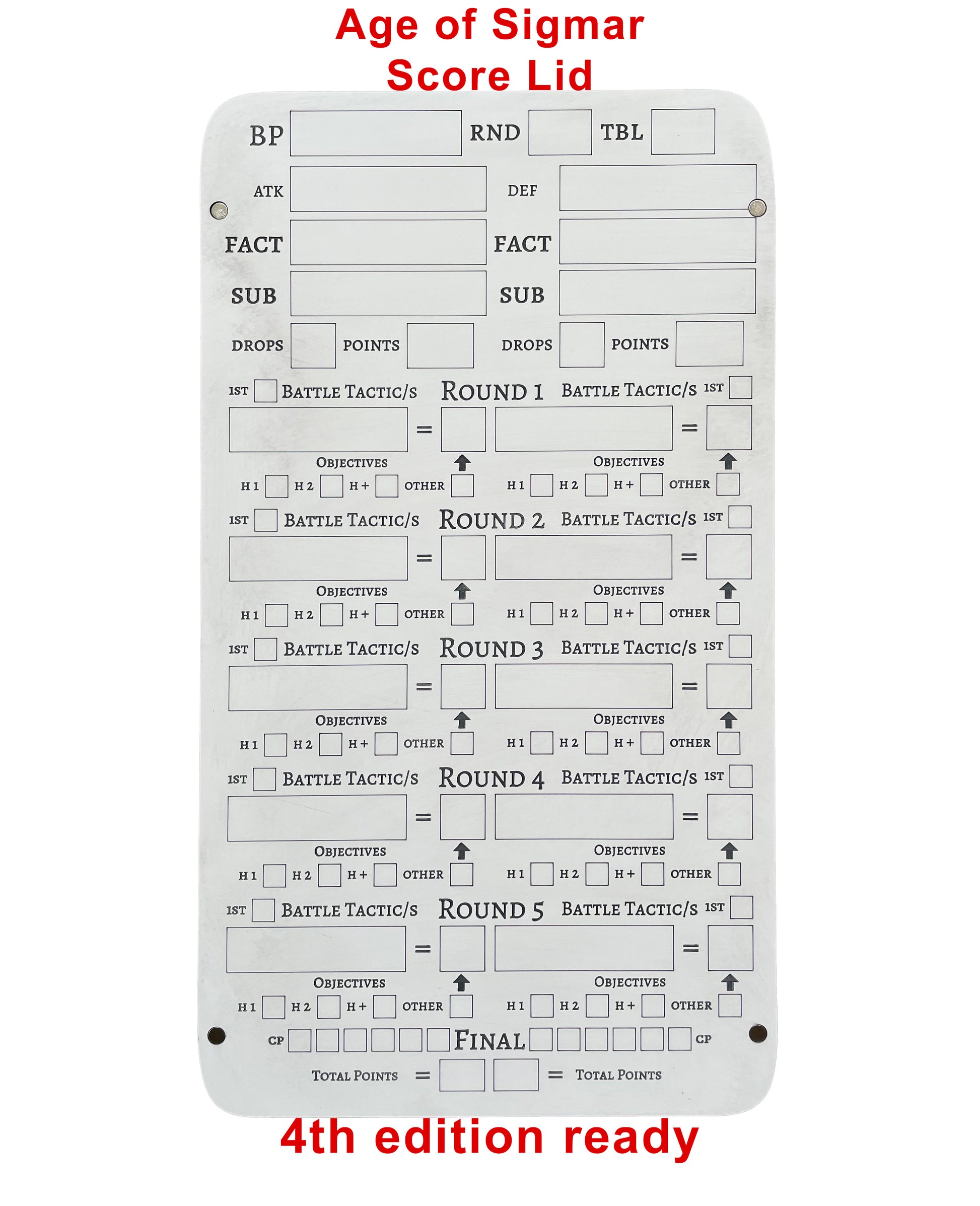 - Optional two-sided Age of Sigmar score sheet (+ $10)